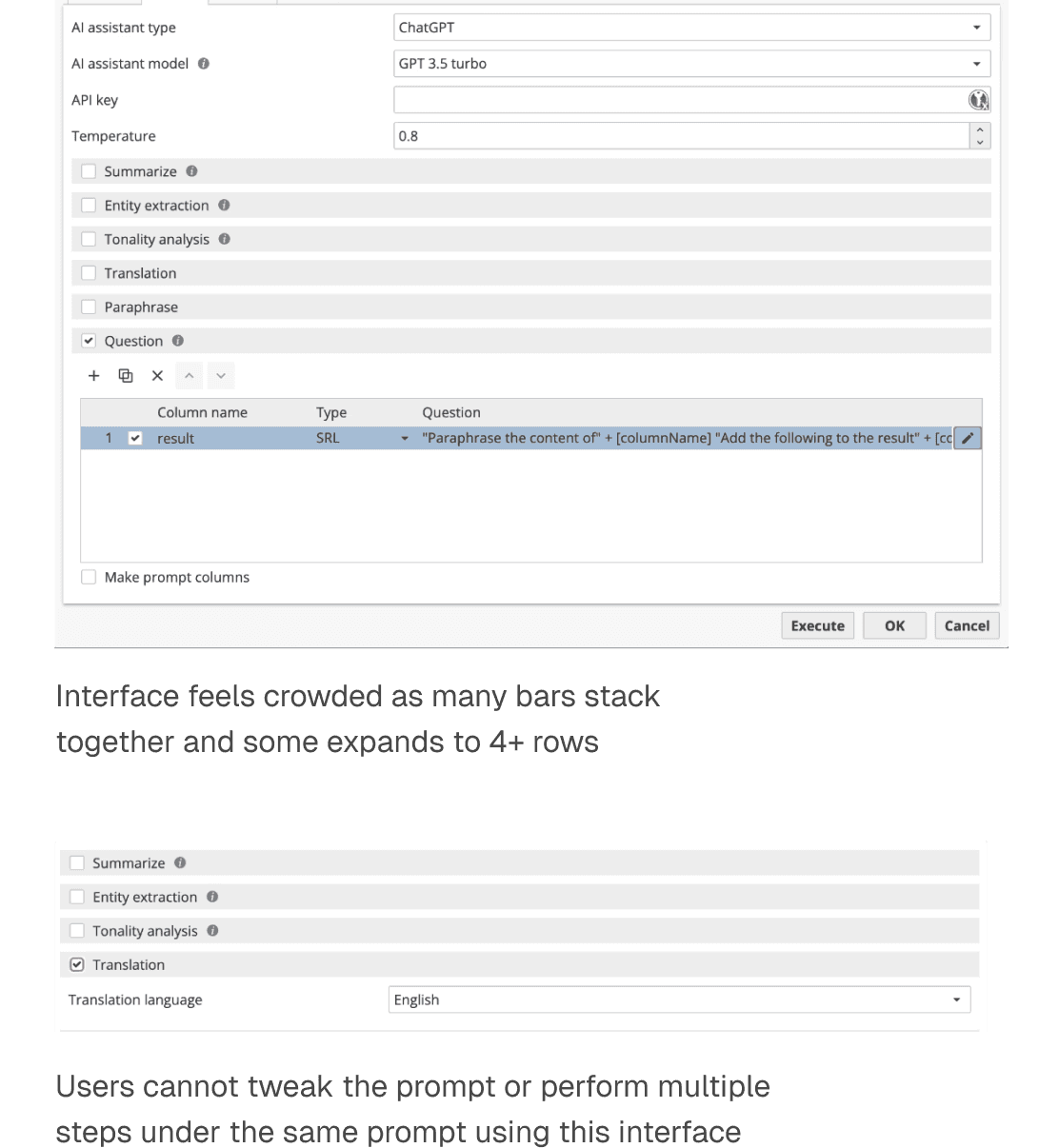 All configuration workflow had to fit within a modal due to current system-wide design, requiring all key features—prompt selection, input, output, and metadata—to be displayed in a limited space without overwhelming the user.